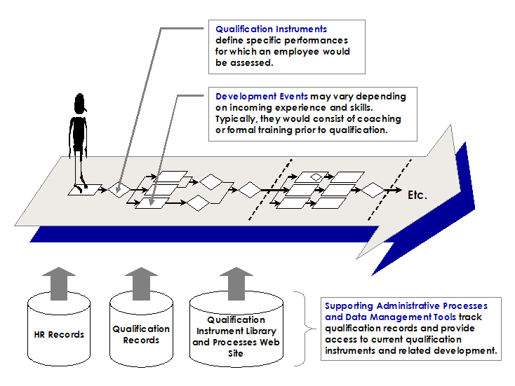 When it comes right down to it, it isn't what you know but it isn't who you know either. It is what you can do that counts! Just having knowledge or skill is no guarantee an employee can perform. Performance means pulling together the right set of information, knowledge, and skills and applying them to the task at hand. In many jobs, performance has to happen in "real time" in challenging environments! Too often, companies really do not verify that employees have the necessary capability to perform. Instead, they make assumptions based on the training their people have completed or the length of time they have been on the job. That may not be enough. In jobs where poor performance can lead to serious problems, or in environments where rigorous process management is required, it is definitely not enough. Question: Doesn't qualification create a lot of extra work for the supervisor? Answer: Actually, a well-designed qualification system will help the supervisor and the employee. By defining the specific expectations, a qualification system reduces the amount of subjectivity in assigning work, creating development plans, and even addressing customer concerns about capability. It may mean that new hires require more supervisory (or coach) attention than normal, if the normal approach is to put people into a "sink or swim" environment. If the risks of sinking are too great, however, in most cases a qualification system will reduce "spin-up time" needed for new employees (or employees changing their role). PRH Consulting uses a structured design process to define both the qualification/certification system and the individual instruments (whether tests, performance observation checklists, etc.) used for verification. The diagram below indicates the key components of a performance-based qualification system. Notice that it can be easily integrated with a performance-based training system to seamlessly allow you to train and qualify your people.